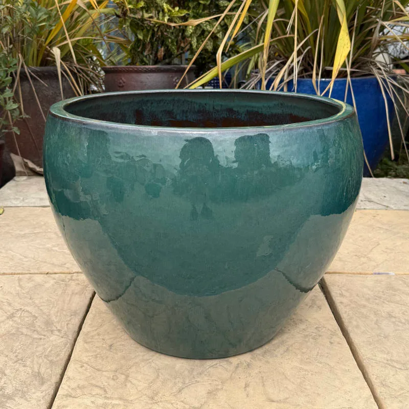 This is a tall planter with no rim in an attractive and unique bubble glaze finish. A completely frost proof pot also available in other colours. A gardeners pot as it is easy to remove plants when re-potting.