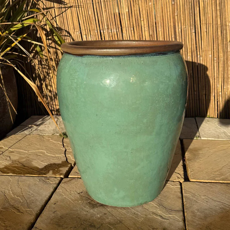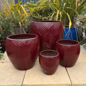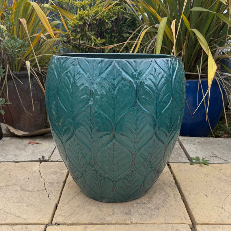These beautifully detailed blue leaf jar pots feature an elegant embossed leaf design with a glossy glaze finish, bringing texture and style to any garden or patio. Their rounded shape makes them perfect for flowers, shrubs, or small trees. The short set is sold with 2 different sized pots.