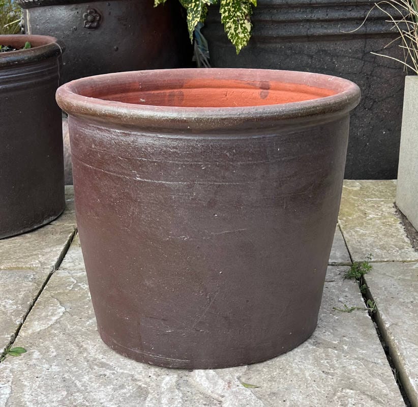 This small sized slat glazed pot comes in a simple cylinder shape with a rolled rim. They are ideal for small trees and shrubs.
