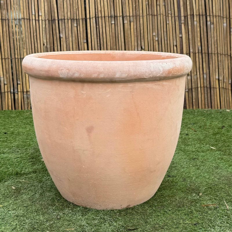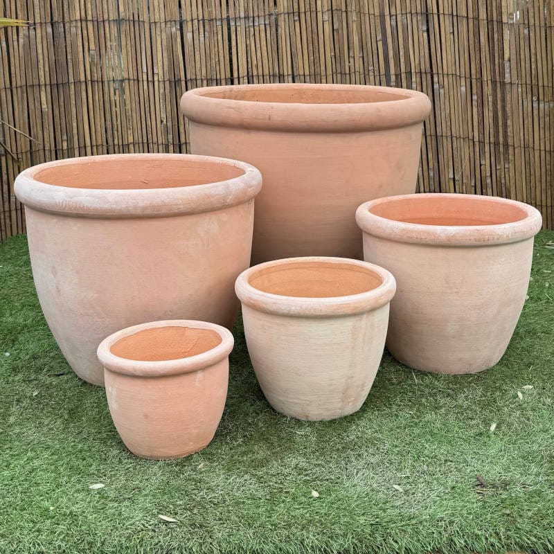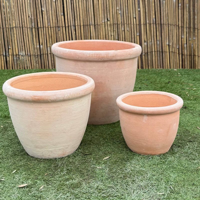 These simple rolled rimmed planters comes in a traditional terracotta. They are perfect for small trees and shrubs. The Short set comes with 3 different sized pots all sold together.
