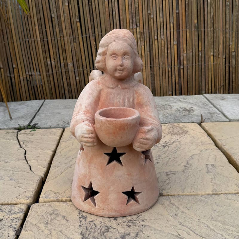 Add a touch of charm to your garden with this handcrafted terracotta angel. Holding a small bowl and adorned with star shaped cutouts, it glows beautifully when lit, casting soft, magical patterns. Perfect as a decorative lantern or a serene garden ornament, it brings warmth and character to any outdoor space.
