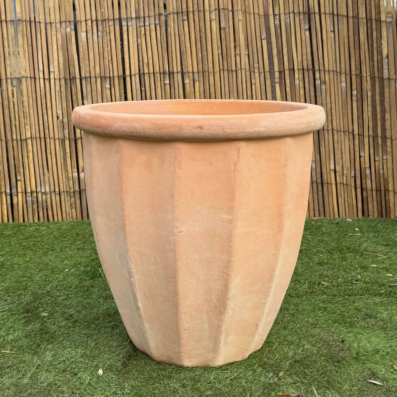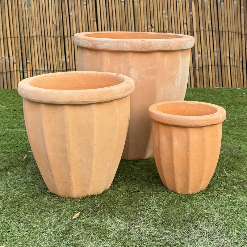 These unique planters come with a ribbed design running from top to bottom in a traditional terracotta. They are ideal for small trees and shrubs and great for adding something unique to the garden. The short set comes with 3 different sized pots sold together.
